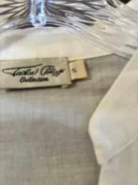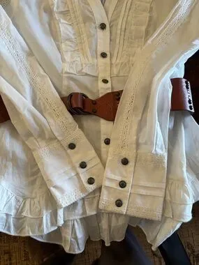 Beautiful Tasha Polizzi blouse with beautiful detailing and gorgeous buttons. Lightweight blouse with ruffled front and pintucking. Long sleeves with lace inserts and buttoned cuffs. Feminine, vintage-inspired look. Pair with belts or layered pieces. Belt for styling only and not included.