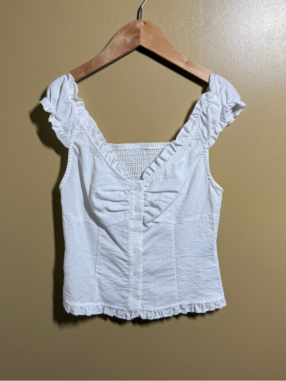 - White sleeveless women's top with ruffle straps and a button-front closure. Smocked back panel for a comfortable, flexible fit. Lightweight and feminine design perfect for warm-weather styling.
