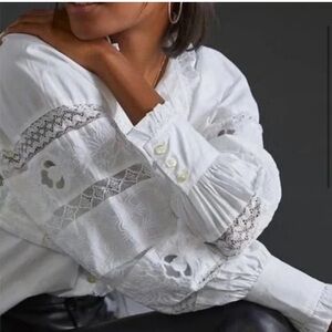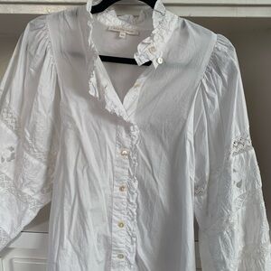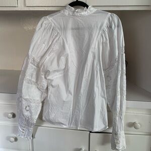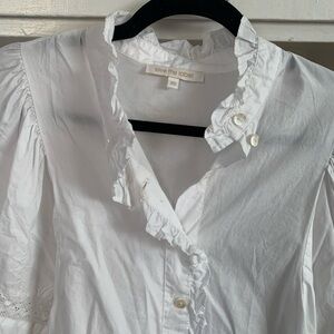 Elegant white blouse with ruffled details and button-up front. Perfect for any occasion. Worn once. Brand is Love the Label from Anthropologie but tagging Sezane for similar style and reach. Tag is XS but fits more like a Small! Cottage core fairy core spring summer vibes!