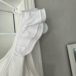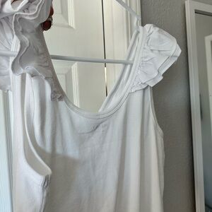 Chic white camisole with ruffled straps. Ideal for layering or wearing alone.