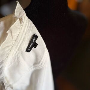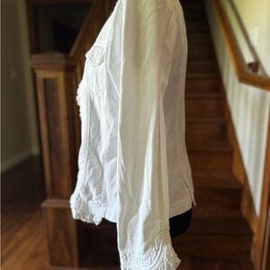 EUC denim jacket with ruffle detail. Worn very few times, no staining or discoloration, smoke free home. Flattering fit and comfortable.