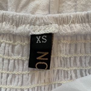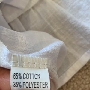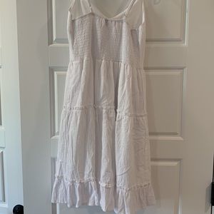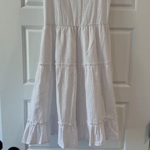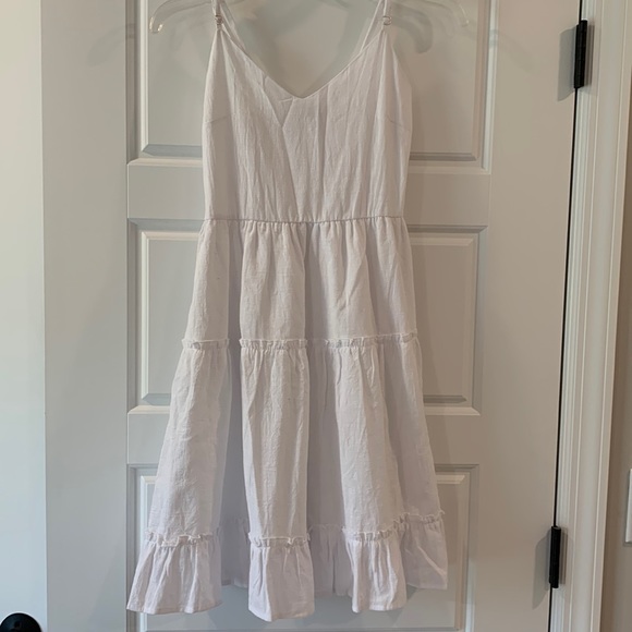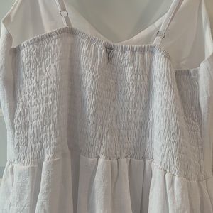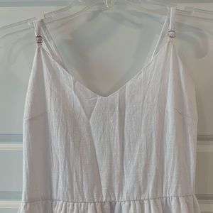 Bright white lined dress with pockets. Adjustable straps with elastic ribbing on the back for a secure fit. Ruffled bottom.
