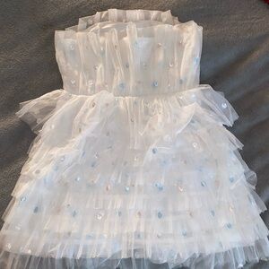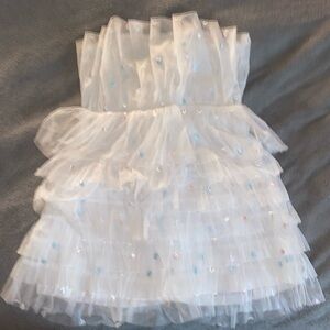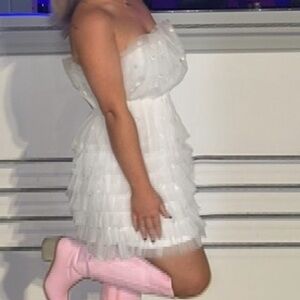 Chic white dress with layered ruffles. Super cute. Bought for a concert. I am 4’11 so on taller girls it might be very short