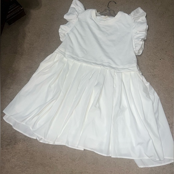 Charming white dress with playful ruffled sleeves. Pockets. Cotton and comfortable! Perfect for any special occasion.