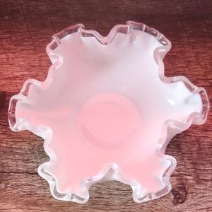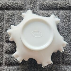 Elegant white ruffled glass bowl with clear edges. Perfect for decor or serving.Vintage Fenton Silver Crest Ruffled Edge Milk Glass Bowl.