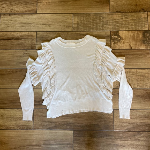 Small white long sleeve top with ruffles down the arms. In great condition, just don't wear it anymore. Fabric is slightly see through so would recommend wearing it with a cami or cute bralette.