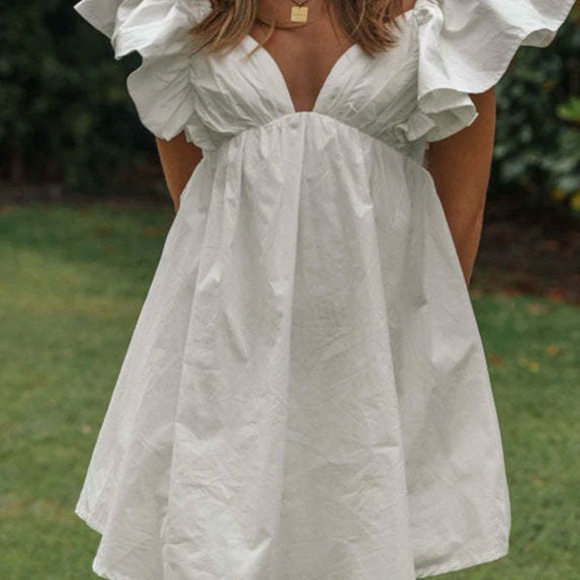 Chic white mini dress with ruffled sleeves. Perfect for summer outings.