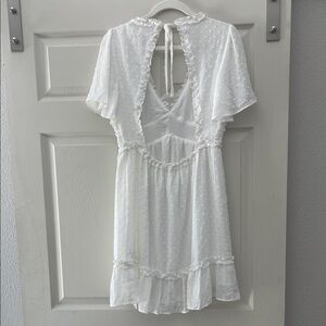 Charming white mini dress with ruffled details. Features a delicate polka dot pattern and flutter sleeves.