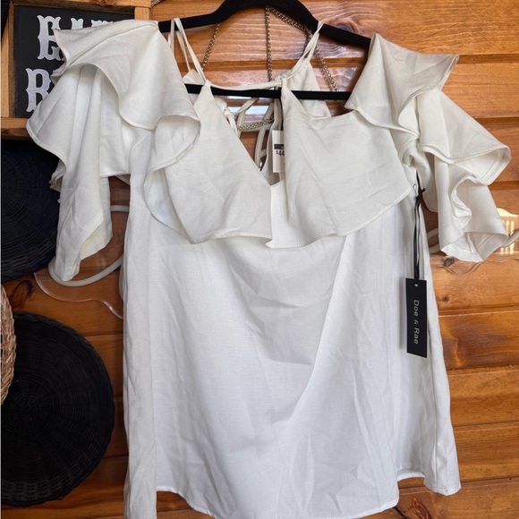 Elegant white off-shoulder top with ruffle details. Perfect for a chic look.
