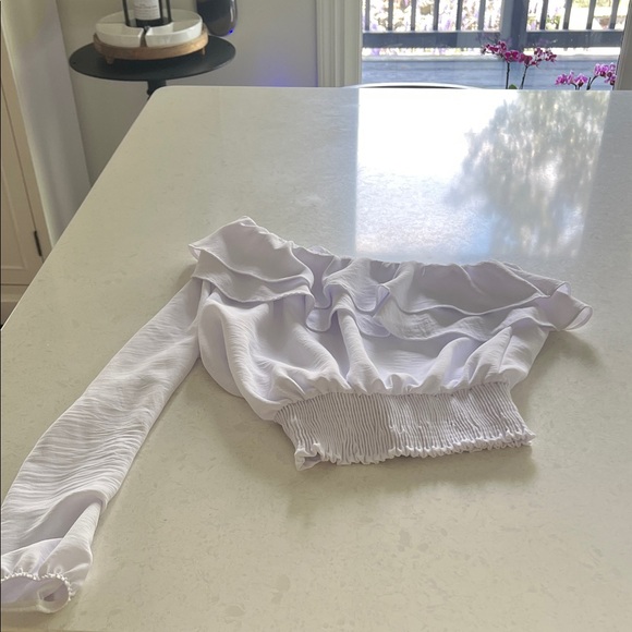 Lightweight off-shoulder crop top with ruffle detail, elastic waist for a snug fit. Long sleeve with delicate cuff. Soft fabric ideal for dressing up or down.