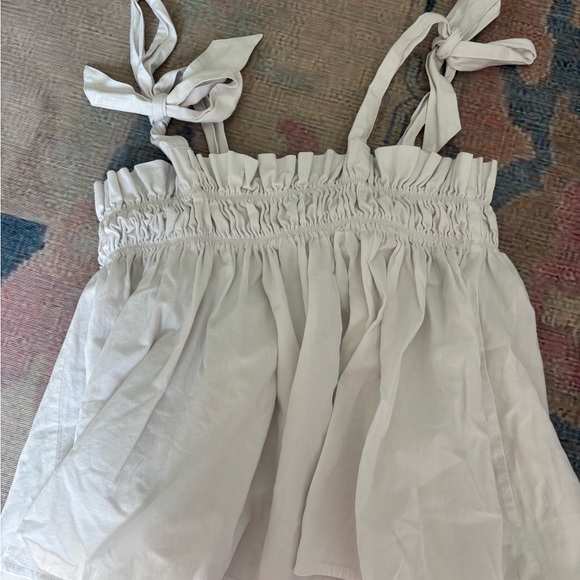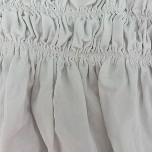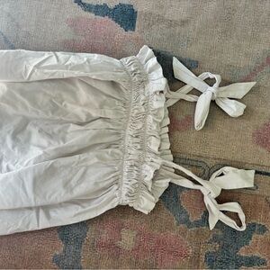 Chic white off-shoulder top with ruffled details and tie straps. Perfect for a casual outing.