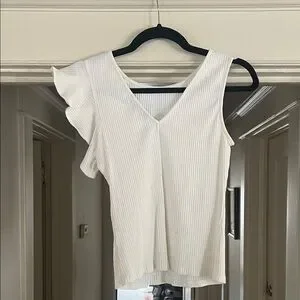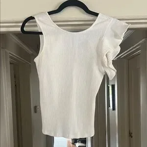 Soft white ribbed tank with a feminine ruffle on one shoulder. Smooth stretch fabric offers a flattering, fitted silhouette. Versatile for casual or dressed-up looks. Easy to pair with jeans, skirts, or layered pieces.