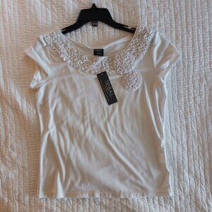 White Ruffled Rosette Collared T-Shirt Womens Large Floral Pattern Decoration