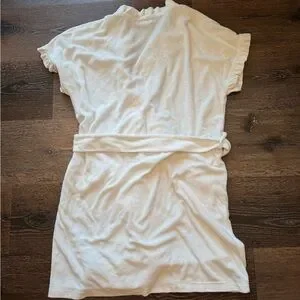 Cozy white robe with ruffled short sleeves and a tie belt. Features two front pockets.