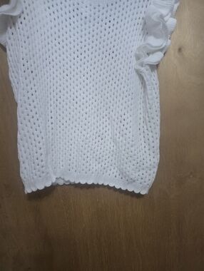 Lightweight white knit shell with feminine ruffled sleeves. Openwork knit provides breathable comfort and a delicate texture. Easy to layer or wear alone for a polished casual look. Designed with a rounded neckline and scalloped hem for subtle detail. Plus Size 22/24