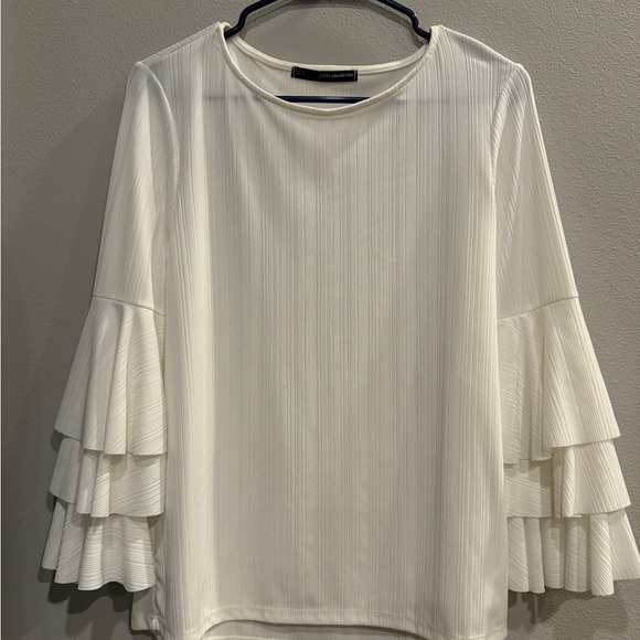 Elegant white top with stylish ruffled sleeves, perfect for any occasion.