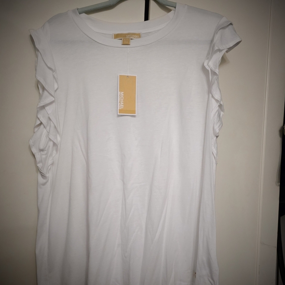 Elegant white top with ruffled sleeves, perfect for any occasion.