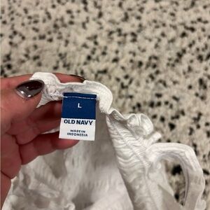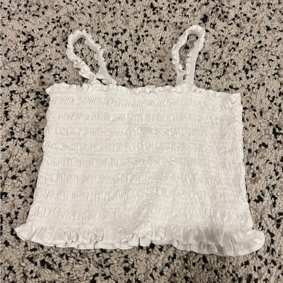 Chic white crop top with ruffled details. Perfect for casual outings. Worn once! In great condition. The entire material is elastic/stretchy. The straps are NOT adjustable. Sits at the waist but obviously comes up if you put your hands up