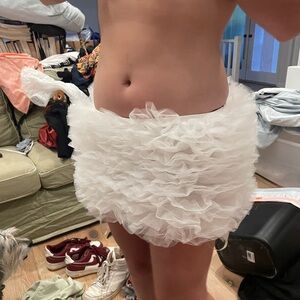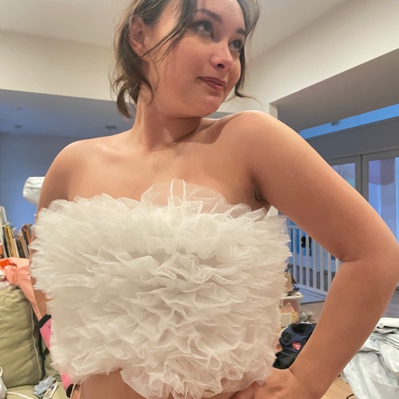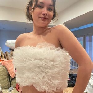 Elegant white strapless top with ruffled design. Perfect for a chic look. Or is it a fun mini skirt?!? Great paired with jeans or dress up with a skirt. This is a versatile addition to your wardrobe. Model is size 4/6 but size 10/12 model also wore it. One size fits most. Ready for all your summer fun