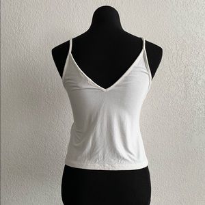 Ruffled white tank top. Deep V-neck. Short top (not quite a crop top.) Gently used, in great condition!