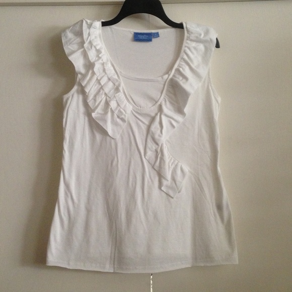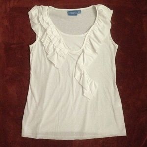 White sleeveless top with ruffled trim. 60% Cotton/40% Polyester blend. Nice weight fabric.
