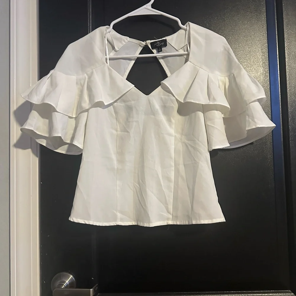 Elegant white ruffled top with a stylish design. Perfect for any occasion.