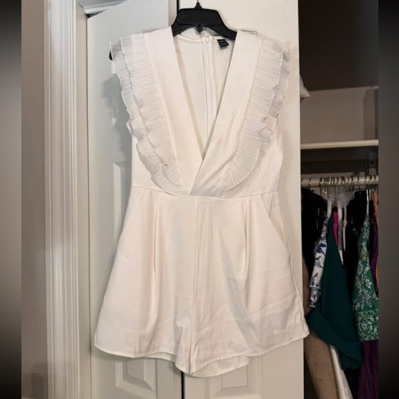 Elegant white romper with ruffled V-neck design. Perfect for any occasion. Worn once!