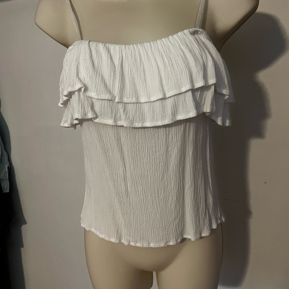 Elegant white ruffled top perfect for any occasion. Lightweight and stylish, this top adds a touch of sophistication to your wardrobe.
