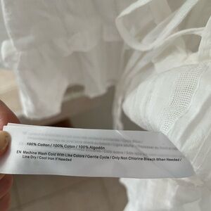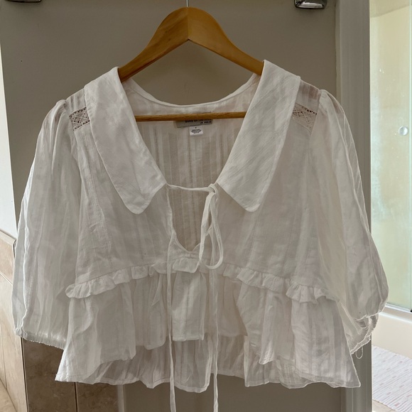 Elegant white ruffled top with a tie-front design. Perfect for a chic and stylish look. Never worn