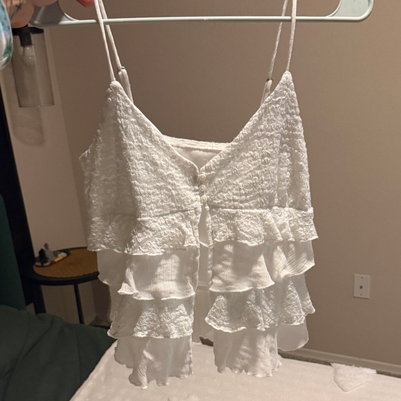 Elegant white ruffled top perfect for any occasion. Features delicate straps and a stylish layered design.
