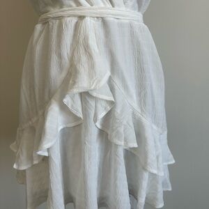 Elegant white wrap dress with ruffled details. Perfect for any occasion.