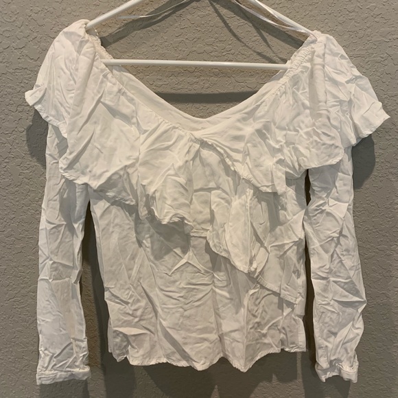 White V neck ruffled blouse. Pairs great with a blazer! Bought from Macy’s.