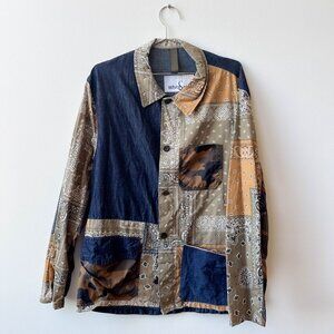 Here is a link to the shirt: https://modesens.com/product/white-sand-88-cotton-and-linen-patchwork-jacket-green-43615915/