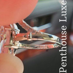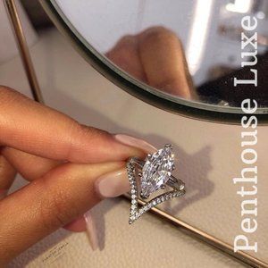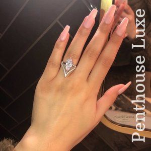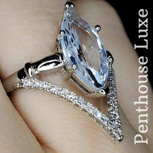 Gorgeous marquise-cut white sapphire solitaire takes center stage on a 925 sterling silver plated band, while a micro-paved "V" accent adds extra sparkle. Engraved with "S925".