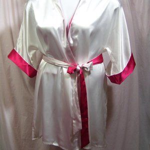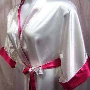 White Satin Robe Red Trim Kimono Wrap w/ Belt Size L