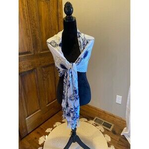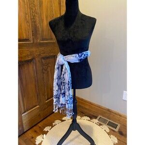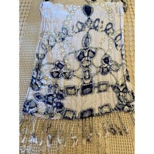 White Scarf with Blue & Navy Design w/ Fringed Ends Beautiful Scarf