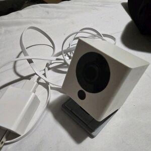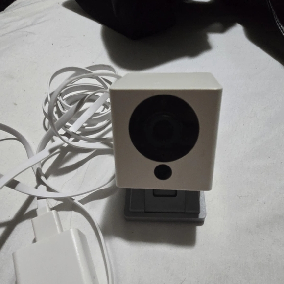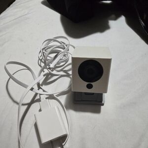 Compact white security camera for home or office use. Easy to set up and connect.
