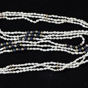 White Freshwater pearls is a 2 piece set, 1 necklace & 1 bracelet. Necklace pearls are 3mm wide & 3 strands. Each strand has 110 pearls spaced between 16 gold & 9 lapis beads. Bracelet has 3 strands with 24 each 3+mm pearls, 6 gold & 4 lapis beads. The lengths are 24” & 7.5” in length & weigh 24.3 & 7.8 grams.