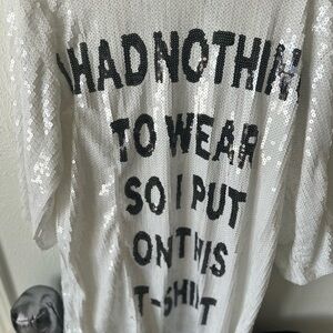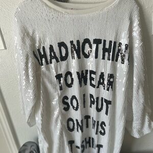 White sequin t-shirt featuring bold black text. Eye-catching and fun design.