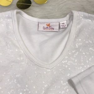 White v neck tee with elbow length short sleeves and sequin front. This brand runs large.