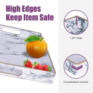 Serving tray size 15.7x 10.2x 1.4 inches, each handle size 3.14 inches, 2 built-in handles for easy movement or carrying. The serving tray with handles feel fine and smooth, the edges are also relatively smooth, not easy to damage and easy to maintain balance.