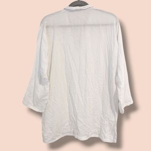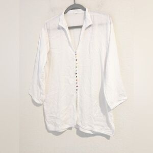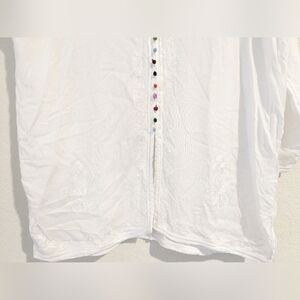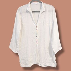 White Sheer Silky Embroidered Rainbow Pom Pom Buttoned Relaxed V-Neck Tunic Blouse Dainty.