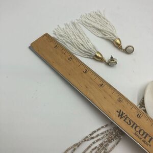 White Shell Beaded Necklace and White Beaded Dangling Pierced Earring Lot Women's. Necklace and earrings are pre-owned. Please see all photos for visible condition. They technically don't go together so not really a set but more of a 2-piece lot. No original box. Necklace has a large white shell with a multi-layered miniature beaded chain. It has a signed tag but I'm not sure who it is - see photos. Necklace has silver tone with lobster clasp. The earrings are long dangling white miniatures beads but is gold tone - pierced with plastic round backs. They do look good together despite the difference in metal color - the metal is behind ears and neck so it doesn't seem off. Brand unknown but is signed. Stands not included.