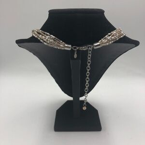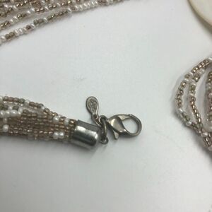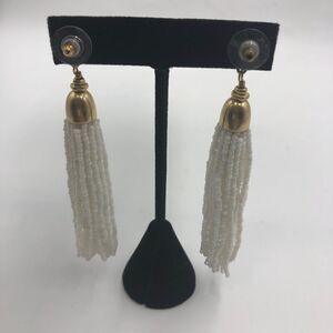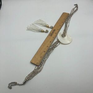 White Shell Beaded Necklace and White Beaded Dangling Pierced Earring Lot Women's. Necklace and earrings are pre-owned. Please see all photos for visible condition. They technically don't go together so not really a set but more of a 2-piece lot. No original box. Necklace has a large white shell with a multi-layered miniature beaded chain. It has a signed tag but I'm not sure who it is - see photos. Necklace has silver tone with lobster clasp. The earrings are long dangling white miniatures beads but is gold tone - pierced with plastic round backs. They do look good together despite the difference in metal color - the metal is behind ears and neck so it doesn't seem off. Brand unknown but is signed. Stands not included.