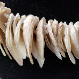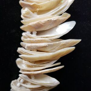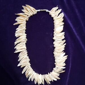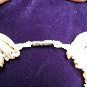 White Shell Chip And Seed Bead Necklace. This necklace is about 18 inches long. It has a bunch of off white/sand colored shell chips in all different sizes. Chips are rough on one side, and have a shiny pearl look on the other. Miniature shiny bright white surround the clasp and separate all of the shell chips. It weighs 3.7 ounces. Silver tone barrel clasp closure. Beautiful Pre-owned necklace, may have minor wear, still in very good condition.