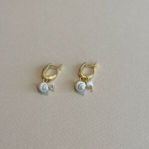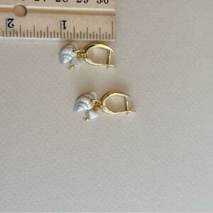 Elegant gold dangle hoop earrings featuring charming white shell accents. Perfect for adding a touch of sophistication to any outfit.