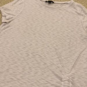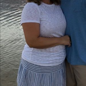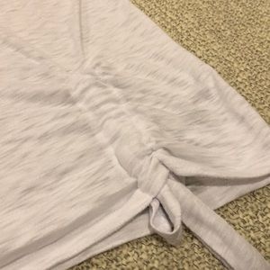 White shirt with ruched waistline. Comfortable, short sleeve, soft material.