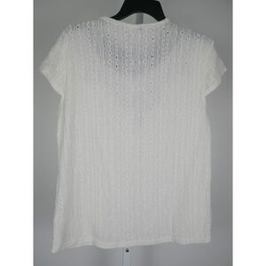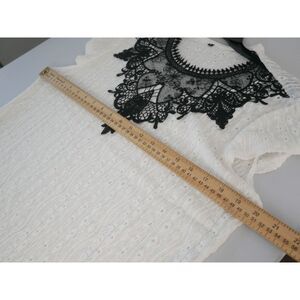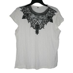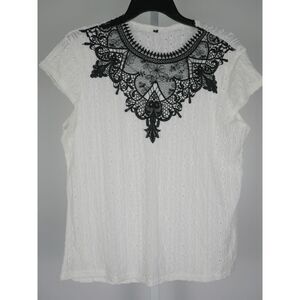 White Short Sleeve Blouse with Black Lace Appliqué Neckline Boho Chic Top L