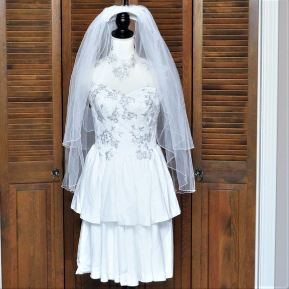 Short custom made dress is perfect for the bride looking for something different, a reception dress, or an elopement dress. Dress has a high neck collar with a sheer top with embroidered silver and white appliques throughout the bodice and zips in back. Skirt is two tiered. Bodice is structured with boning and padding (you don't need to wear a bra). Few loose thread, no veil.