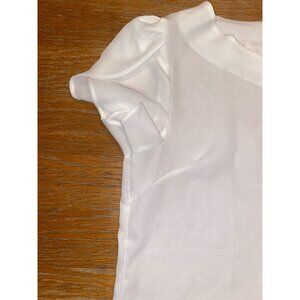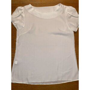 This elegant white blouse features stylish puff shoulders and a classic round neckline, offering a versatile option for professional attire. The lightweight material ensures comfort throughout the day, while the timeless design complements various wardrobe choices, making it a staple piece for work or formal occasions.